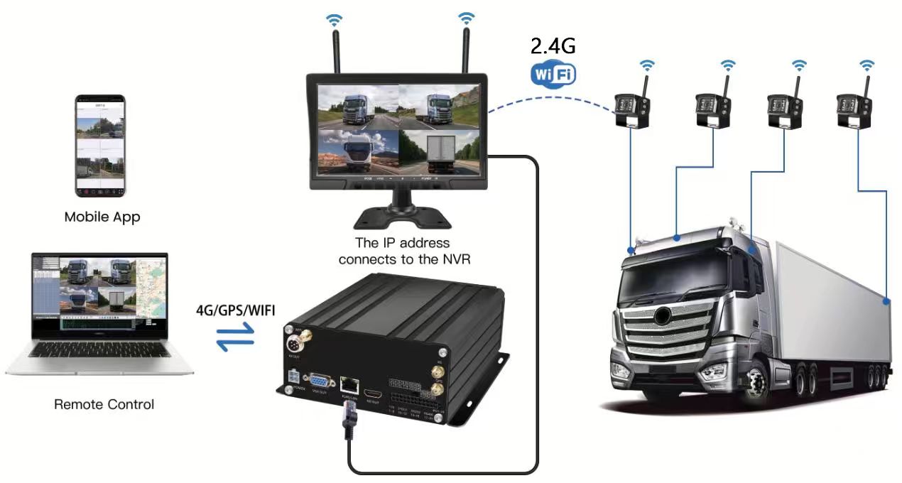 Carleader 10,1 tums 4CH trådlöst mobilt NVR-system för hårddisk, ett banbrytande mobilt NVR-system som är designat för flotthantering. Systemet använder 4st trådlösa IP-kameror som paras ihop med en 10,1 tums trådlös bildskärm via 2,4GHz-signal, anslut sedan monitorn och NVR med en RJ45-kontakt. inget behov av extra ledningsproblem, mer effektivt för installation och flotthantering.
