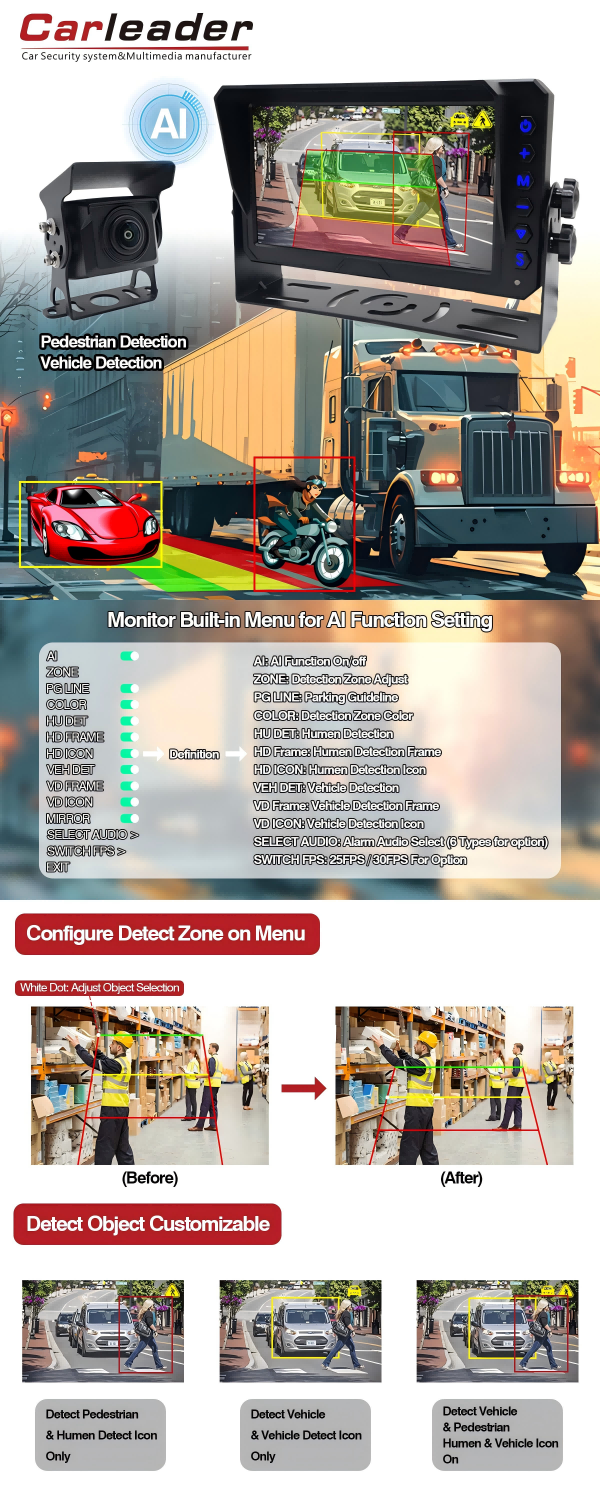 Carleader 7 Inch AI BSD Blind Spot Detection Monitoring System Support AI Calibration är designad med avancerade AI högprecisionsalgoritmer och användarvänlig meny cz-drift. Detta AI-kamerasystem förser förare med varningar för fotgängare och fordon med hög precision i alla väder, vilket effektivt minskar risken för trafikolyckor. AI-övervakningskamerasystem är lämpligt för privata bilar, kommersiella flottor och specialfordon. Fleet AI-systemet har stark integration och kompatibilitet, hållbarhet och övervakningsmöjligheter i realtid.