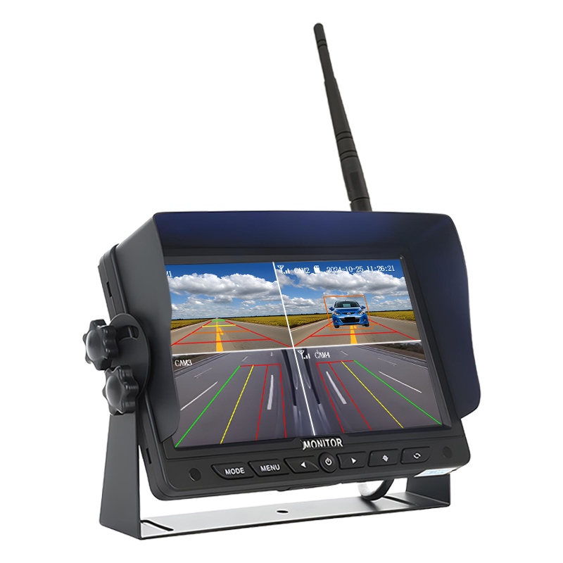 Carleader 7-tums BSD Blind Spot Detection Wireless Monitoring System, ett digitalt trådlöst kamerasystem integrerat med AI-detekteringsfunktion, stödjer fotgängare och fordonsdetektering och larm, varnar föraren om fordonets omgivningssituation. Upp till 4 kanaler 720P trådlösa kameror automatisk ihopparning, varje kanal stöder AI-detekteringsfunktion. Övervaka den inbyggda AI-kalibreringsmenyn för att justera storleken på detektionsområdet enligt faktisk installationsposition och vinkel. Monitor Stöder valfri funktion för loopinspelning, stöd för upp till 256 GB SD-kortlagring.