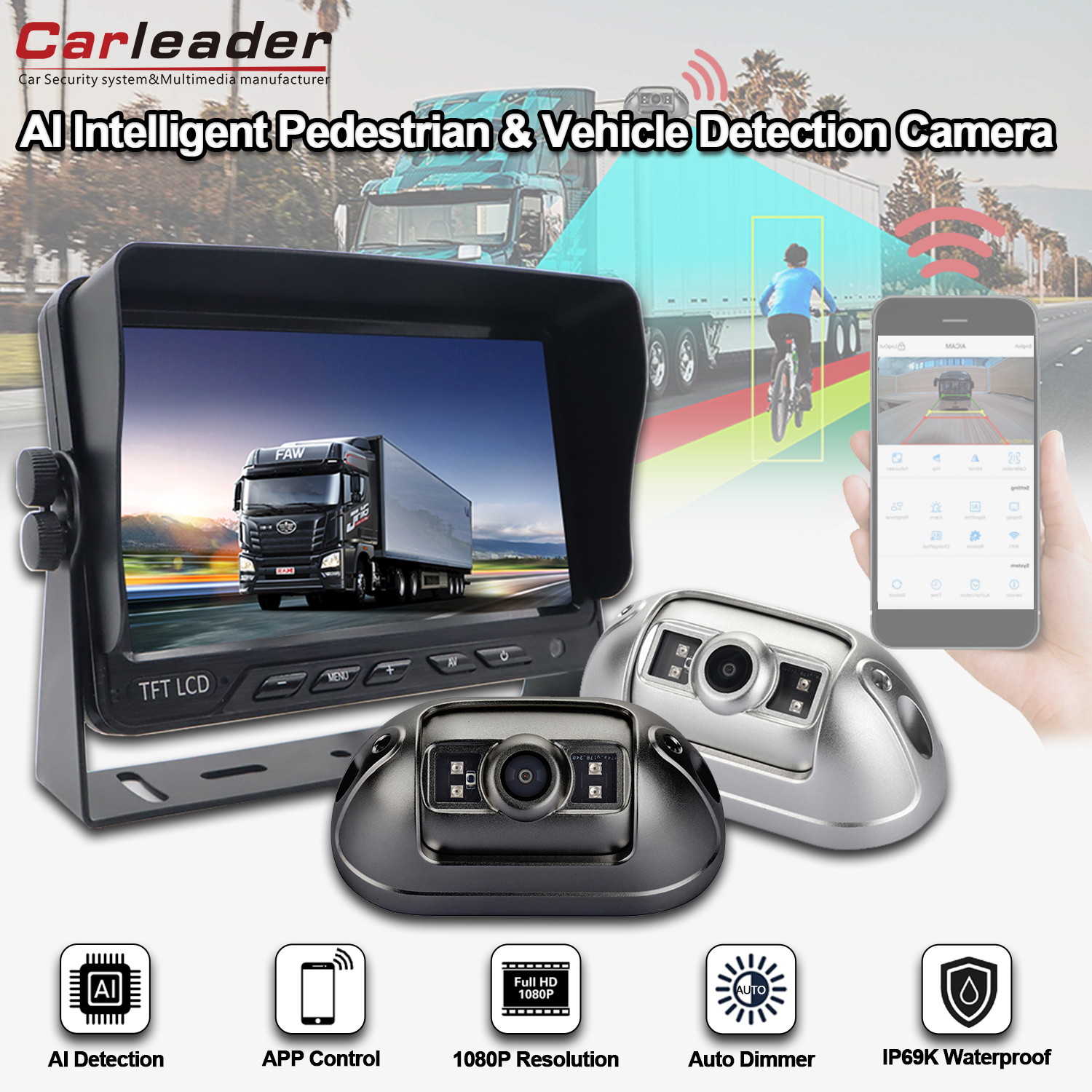 Stöd AI-kalibreringsinställning med mobiltelefon via WIFILedareAI BSD fordonskamerasystem för fotgängare och fordonsdetektering ett högpresterande 7-tums AI BSD-system som stödjer detektering av fotgängare och fordon och larmar föraren. kamera med en USB-port WIFI-modul, tillåter användaren att justera AI-funktionskalibrering och kamerans grundinställning med mobiltelefon via WIFI-anslutning, inklusive upplösningsalternativ,kalibrering av detektionsområde, larmljudtyp och volym, känslighet för detekteringstrigger, alternativ för detekteringsobjekt, etc. Hjälp användaren att passa sitt fordon bättre via justering.