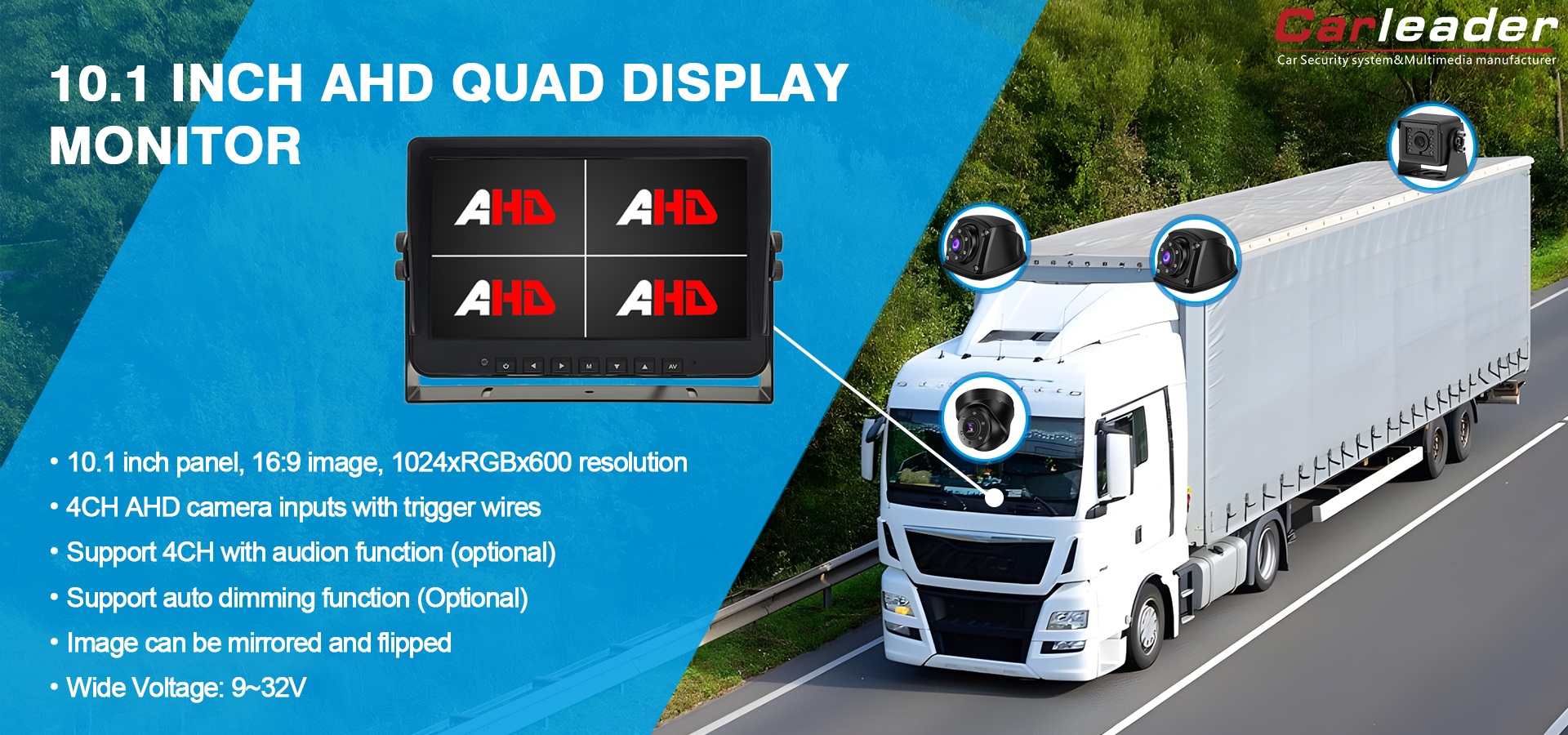 Carleader 10.1-inch 4AV Inputs Quad View AHD Vehicle Monitor and Camera Kit include 1x high-performance 10.1-inch quad AHD monitor, 1x In-cabin view dome camera, 2x side view cameras (left & right), 1x rear view camera, This solution designed for versatile surveillance and display applications. Combining cutting-edge technology with user-centric features, this monitor delivers crisp visuals, robust functionality, and adaptability to meet diverse operational needs.