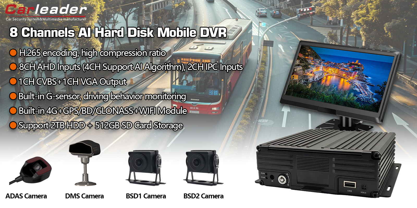 Vi presenterar Carleader8CH AI HDD Mobil DVR Stöd ADAS+DMS+BSD, en 8-kanals high-end hårddisk digital videoinspelare konstruerad för professionell fordonsövervakning och intelligent flotthantering. Kombinera robust hårdvarudesign med avancerade AI-algoritmer inklusive ADAS, DSM, BSD. Den levererar pålitlig, högkvalitativ videoinspelning, omfattande förarassistans och proaktiv säkerhetsövervakning – allt i ett enda integrerat system.