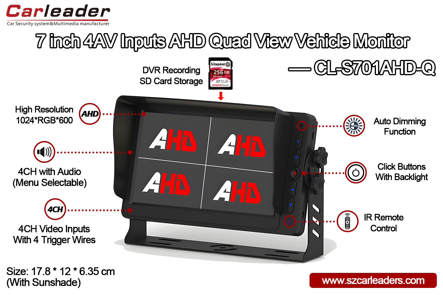 Carleader är stolta över att presentera dig vår7-tums 4CH AHD-ingångar Quad View Display Monitor, quad view-design kan stödja 4 kanaler för fordonskamera, såsom frontvy, sidovy x2, bakifrån, tillåter förare av stora fordon (bussar, lastbilar och skåpbilar, att övervaka flera vyer av omgivningen medan de kör fordonet.