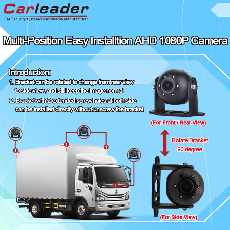 LedareAHD Heavy Duty Vehicle Fram/Sido/Rear View Kamera med fäste installationshål upptill, nedåt, höger, vänster, vilket gör att kameran kan justera kamerafästet för att passa olika kamerapositioner, såsom front-, sido- och bakvy, gör denna kamera mer kompatibel för fordonssäkerhetsövervakningssystem.
