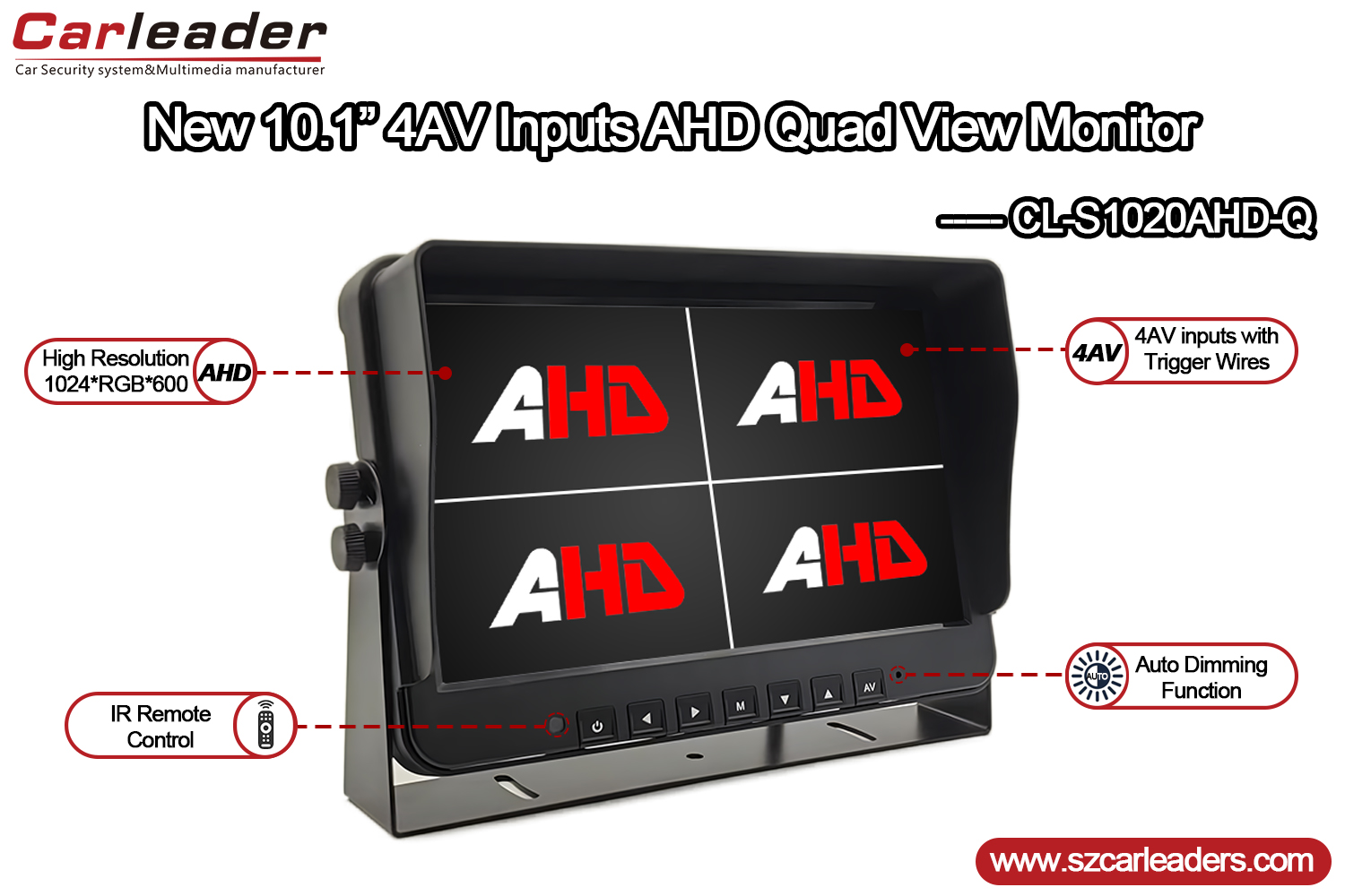 Idealisk för tillämpningar för fordons-, säkerhets- och industriell övervakning,Ledare10,1 tums 4CH Quad Display AHD-skärm för tunga fordonkombinerar robust funktionalitet, tydlig bildkvalitet och användarkonfigurerbara alternativ i ett kompakt och hållbart paket.