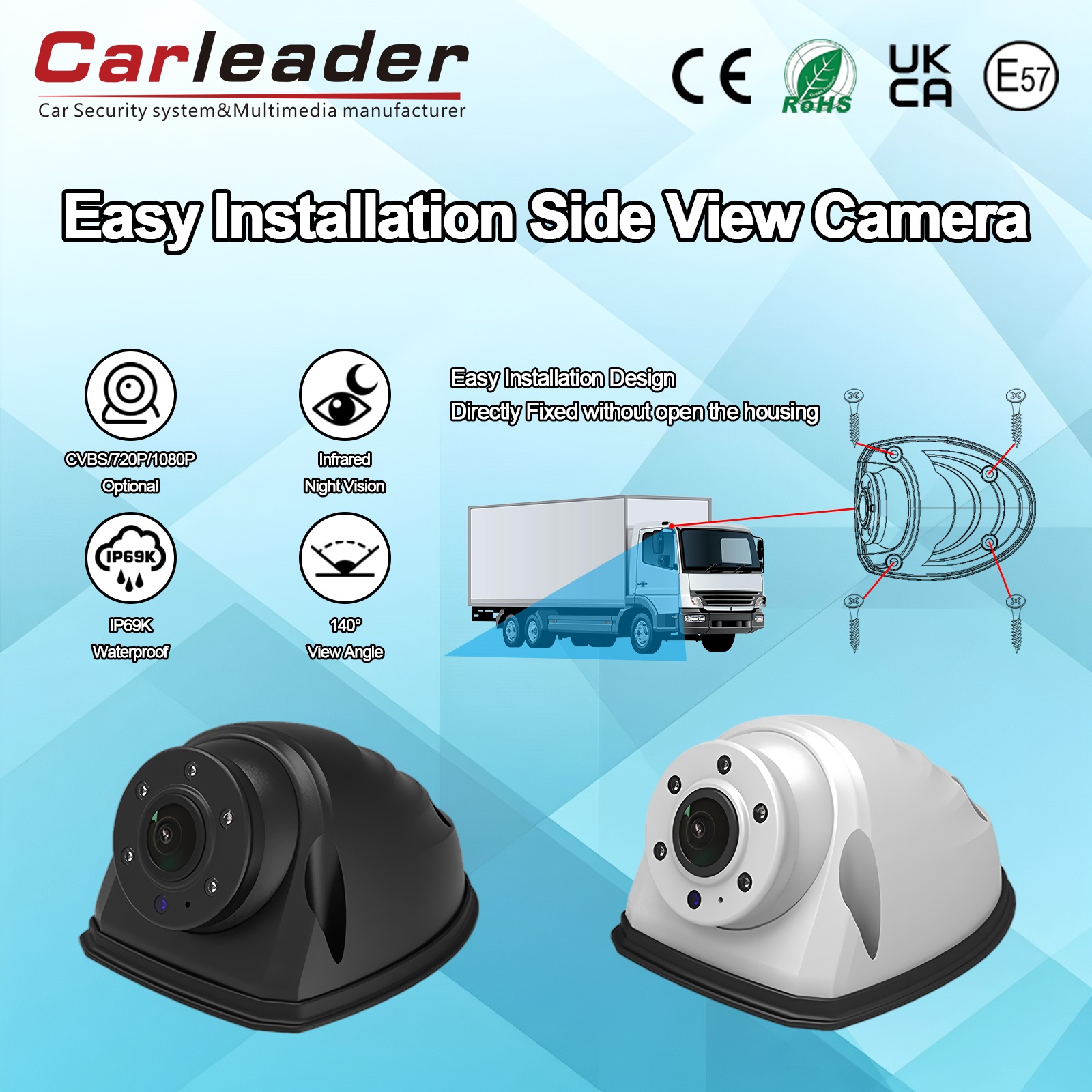 LedareAHD Snabbinstallation Heavy Duty Sidokamera Vitär en högpresterande AHD-kamera med sidovy designad för att ge klar sikt i alla svåra väderförhållanden. Detta kompakta kamerasystem är huvudsakligen utformat för sin multifunktionella och hållbara prestanda och är lämpligt för kommersiella fordon, industriell utrustning och säkerhetsapplikationer där tydlig perifer sikt behövs.